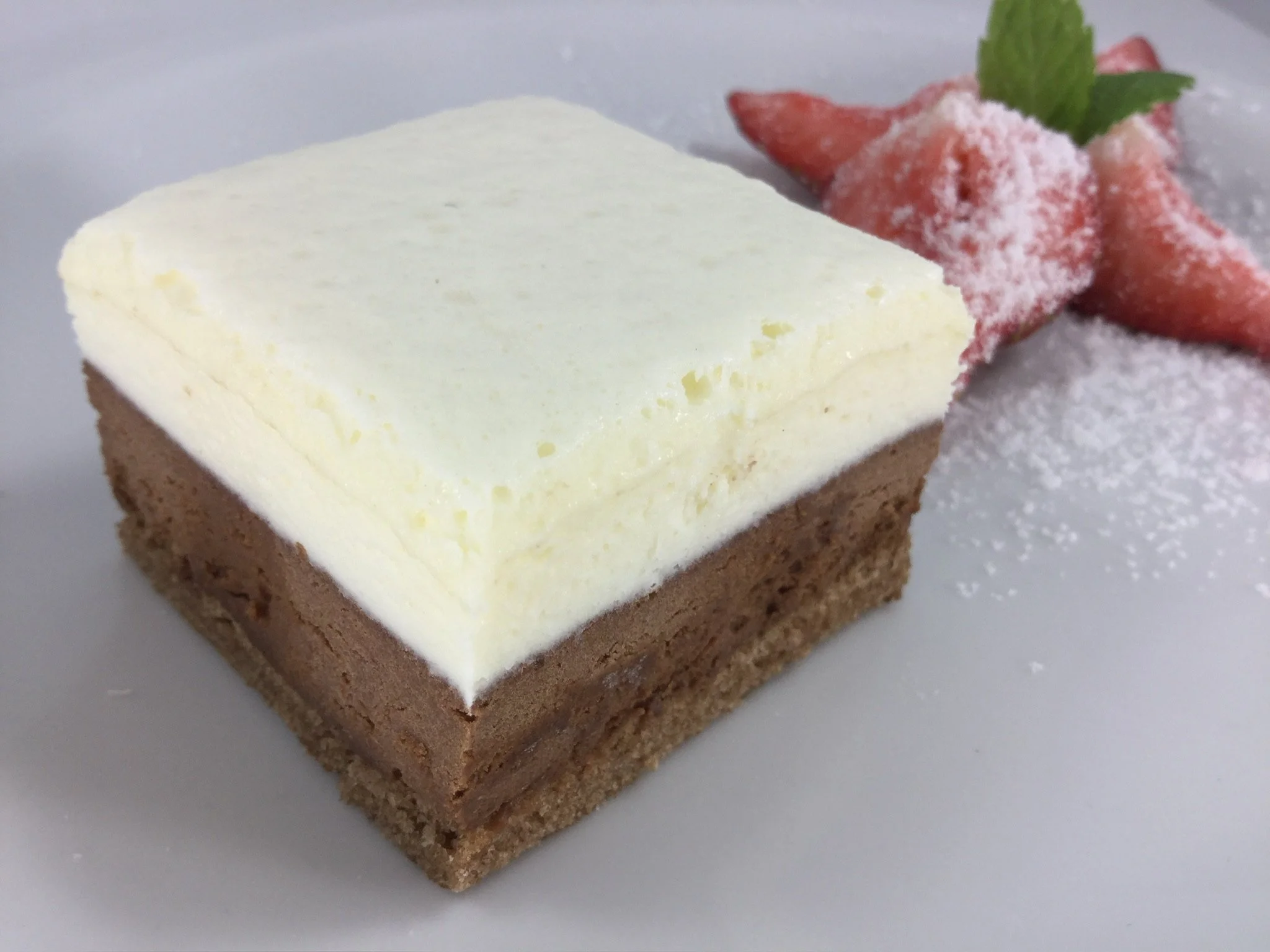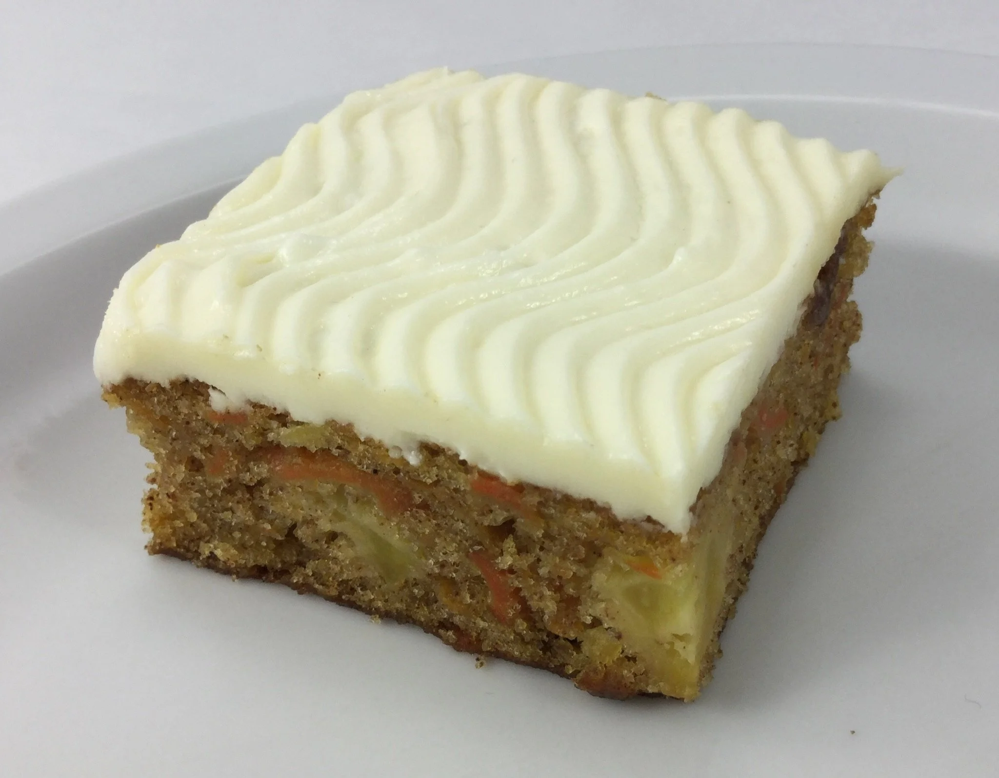 Moist carrot cake with a creamy layer of cream cheese topping.