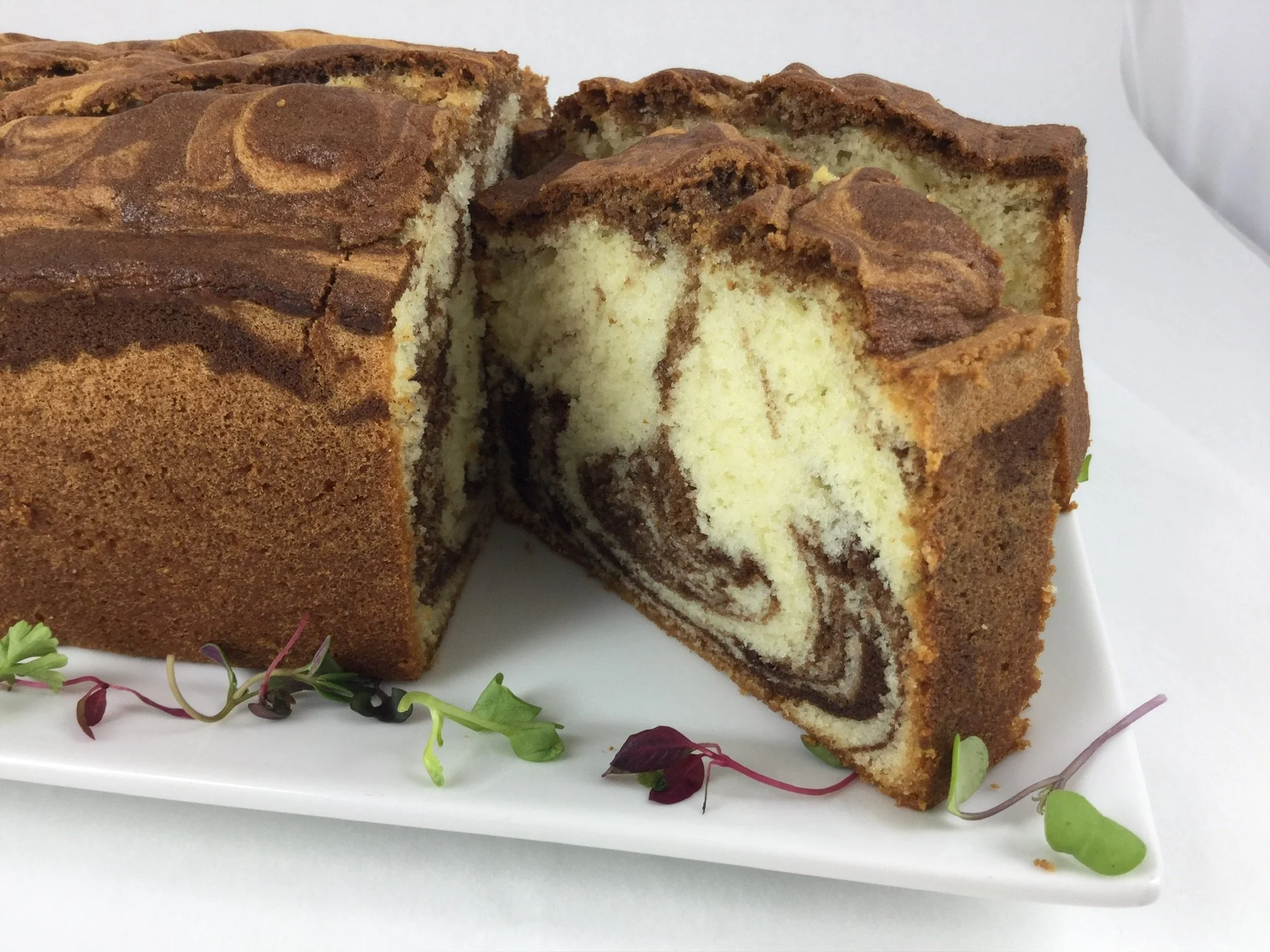 Marble pound cake slice featuring a swirl of rich chocolate and vanilla flavors.