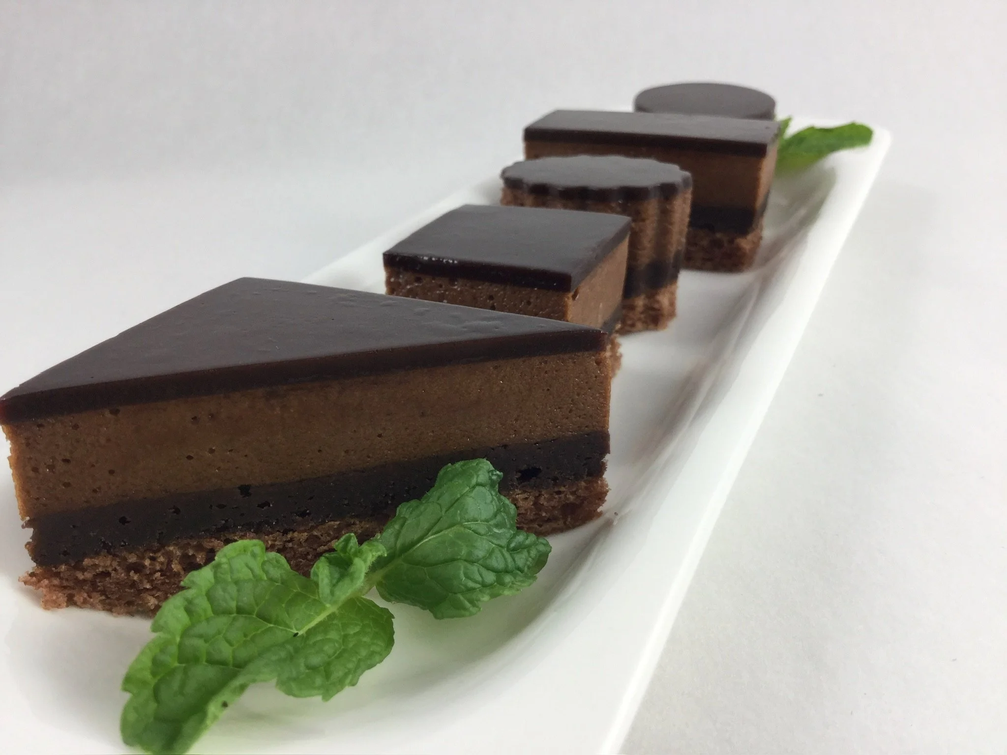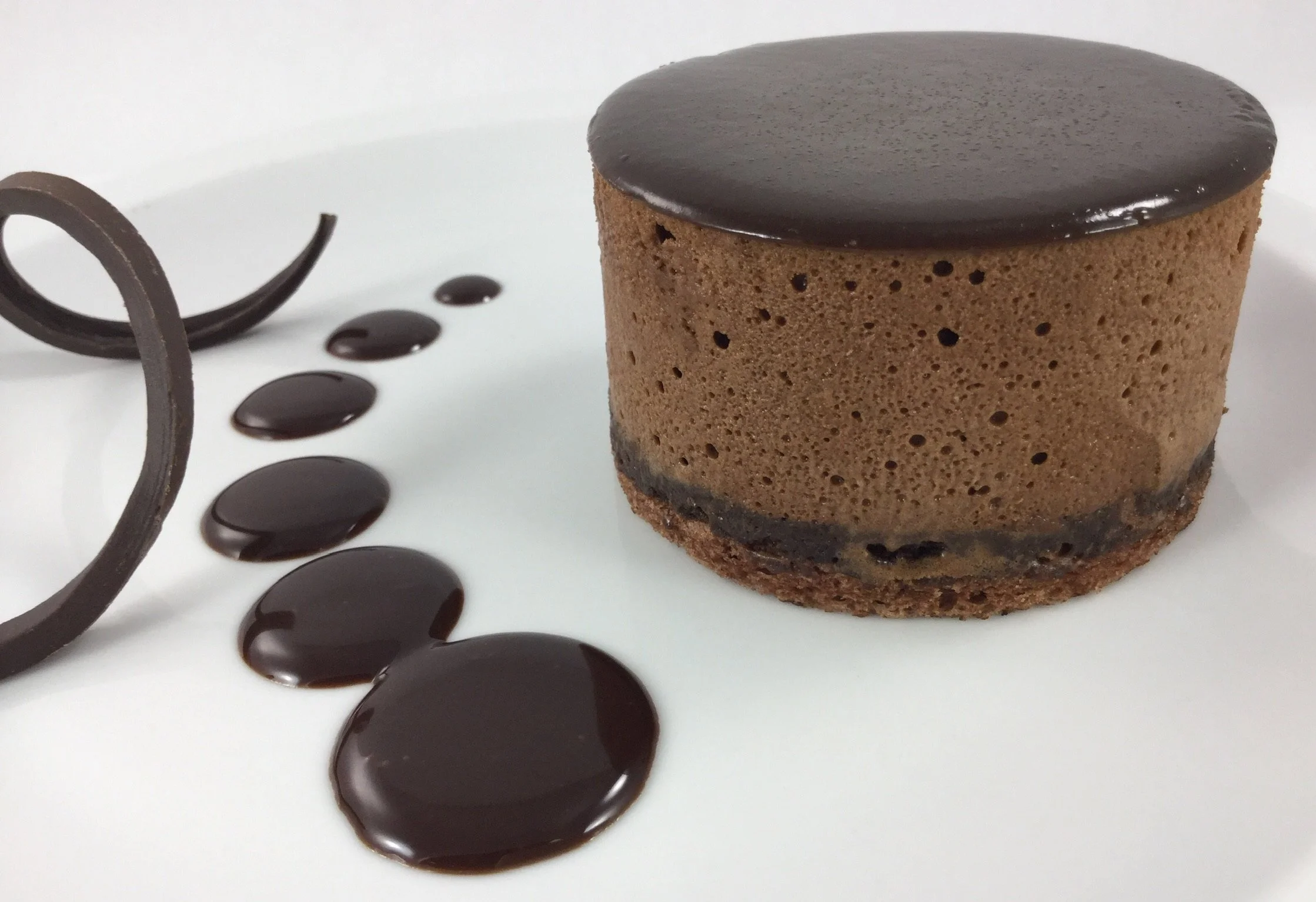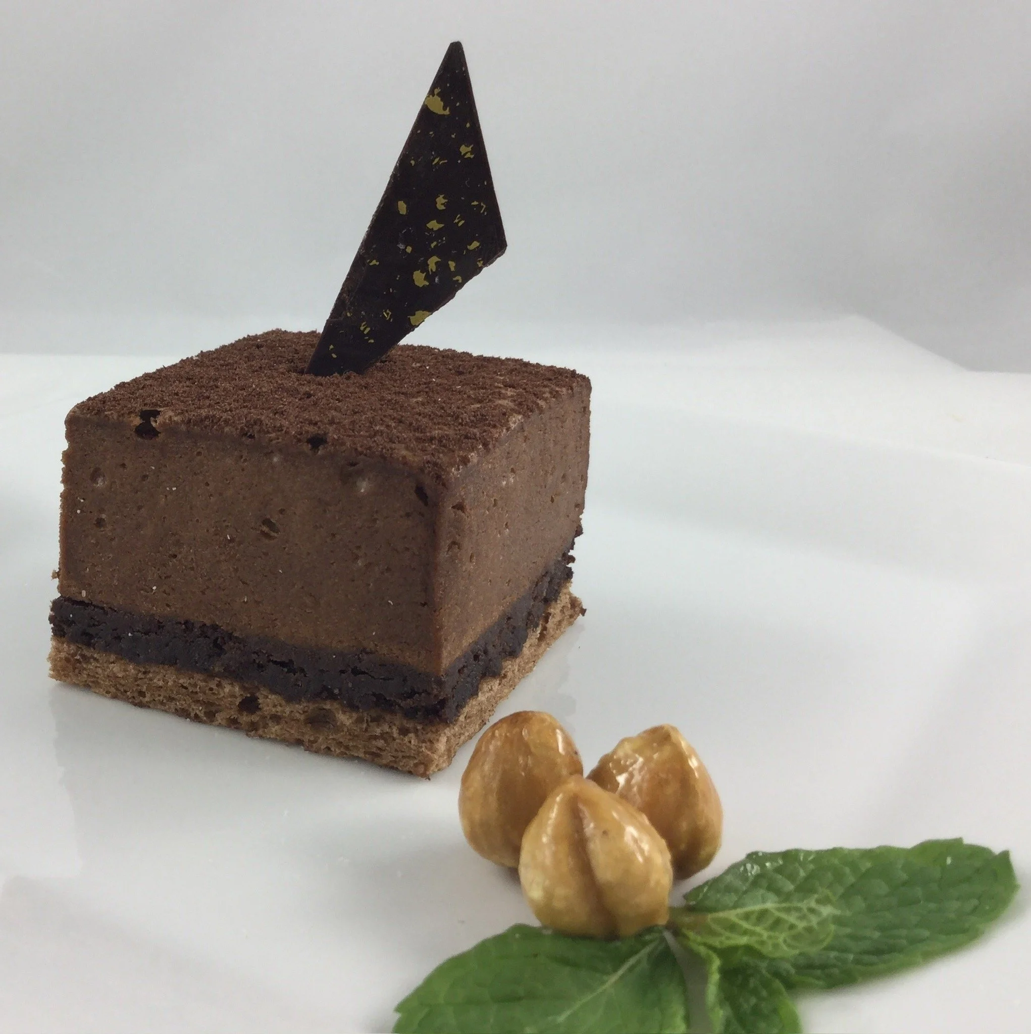 Chocolate decadence mousse with a silky texture, topped with a thin layer of rich chocolate ganache.