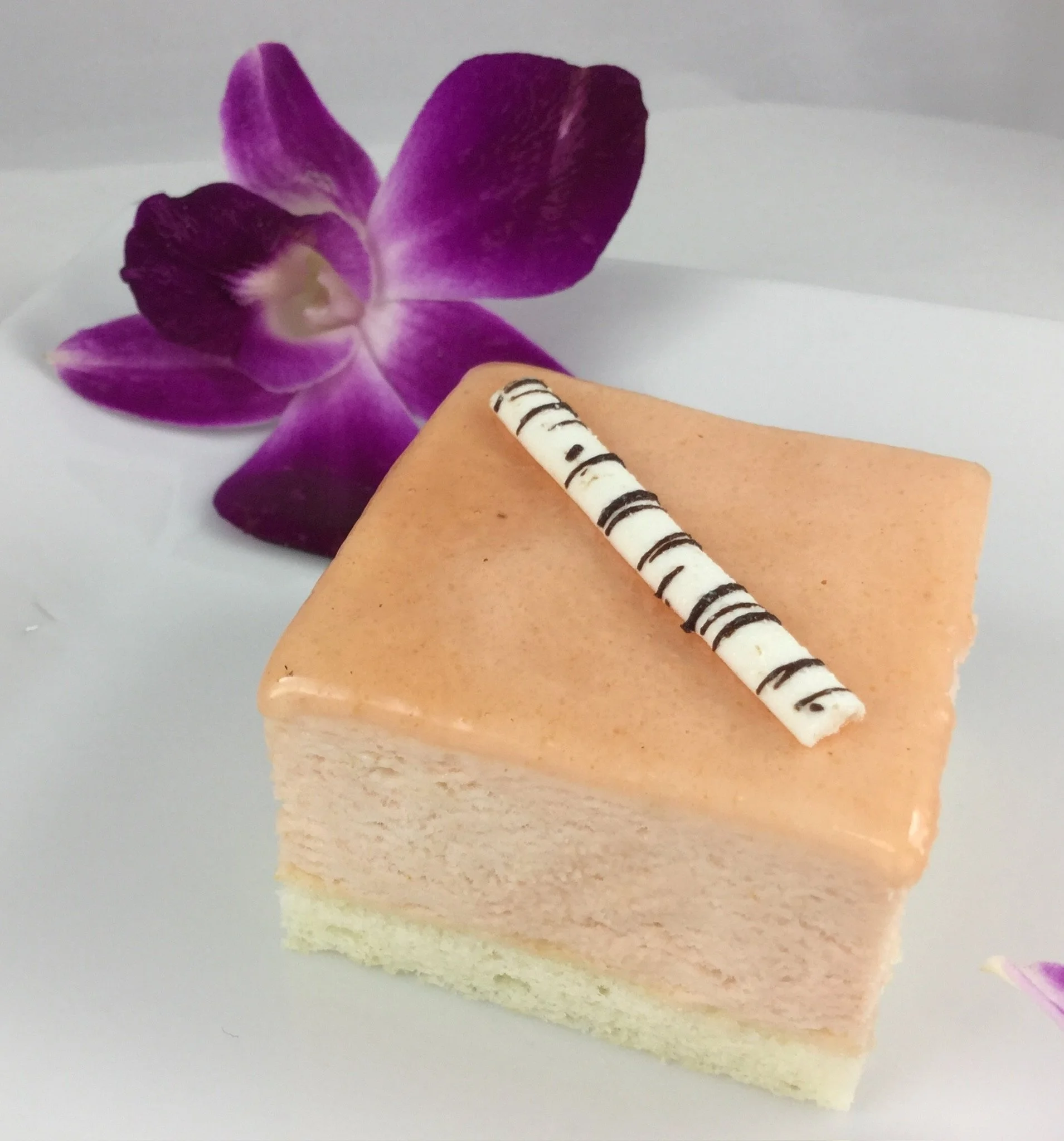 White chocolate raspberry mousse with creamy texture and tangy fruit layer.