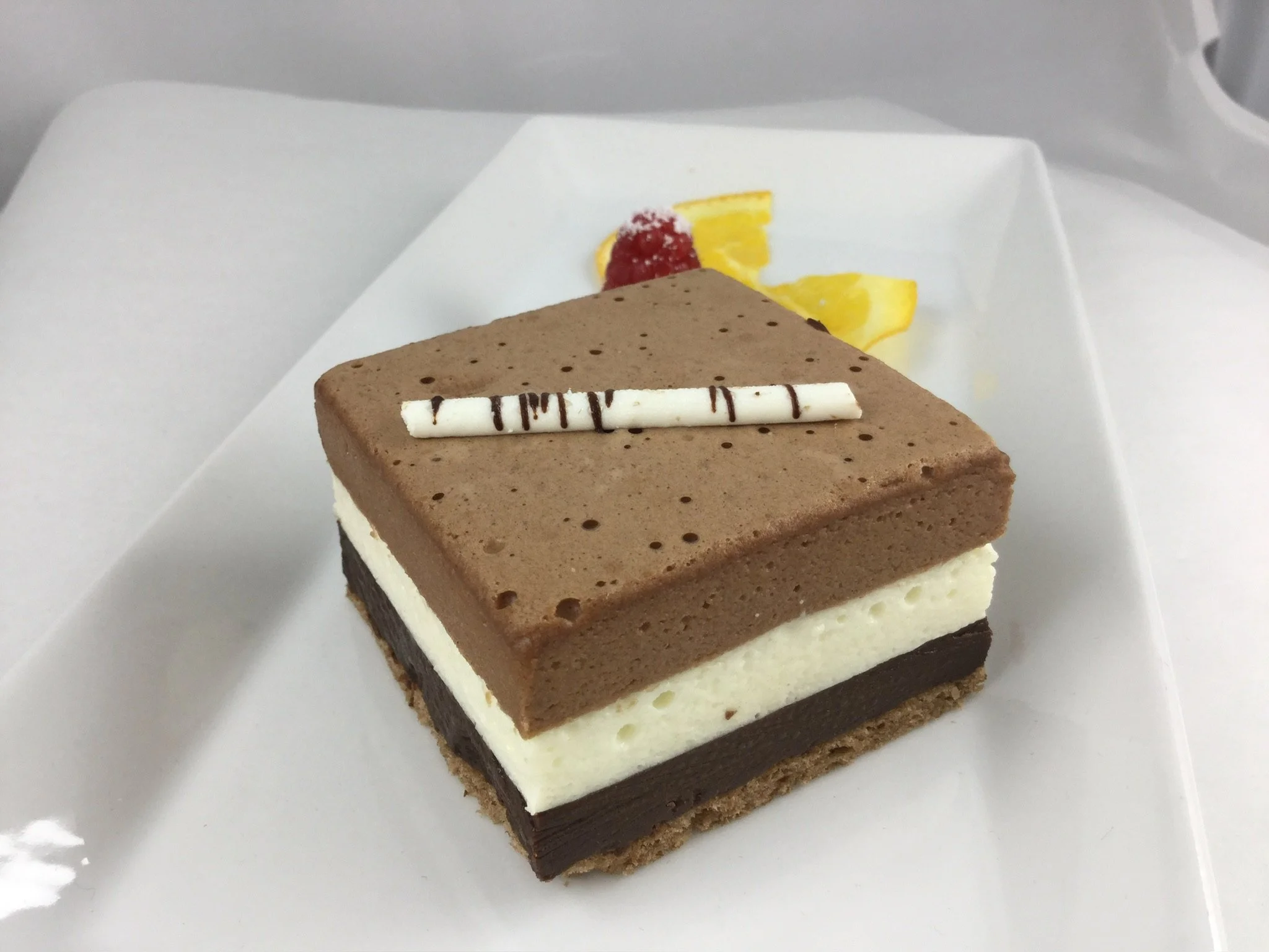 Triple chocolate mousse with layers of white, dark, and milk chocolate, rich in flavor and texture.