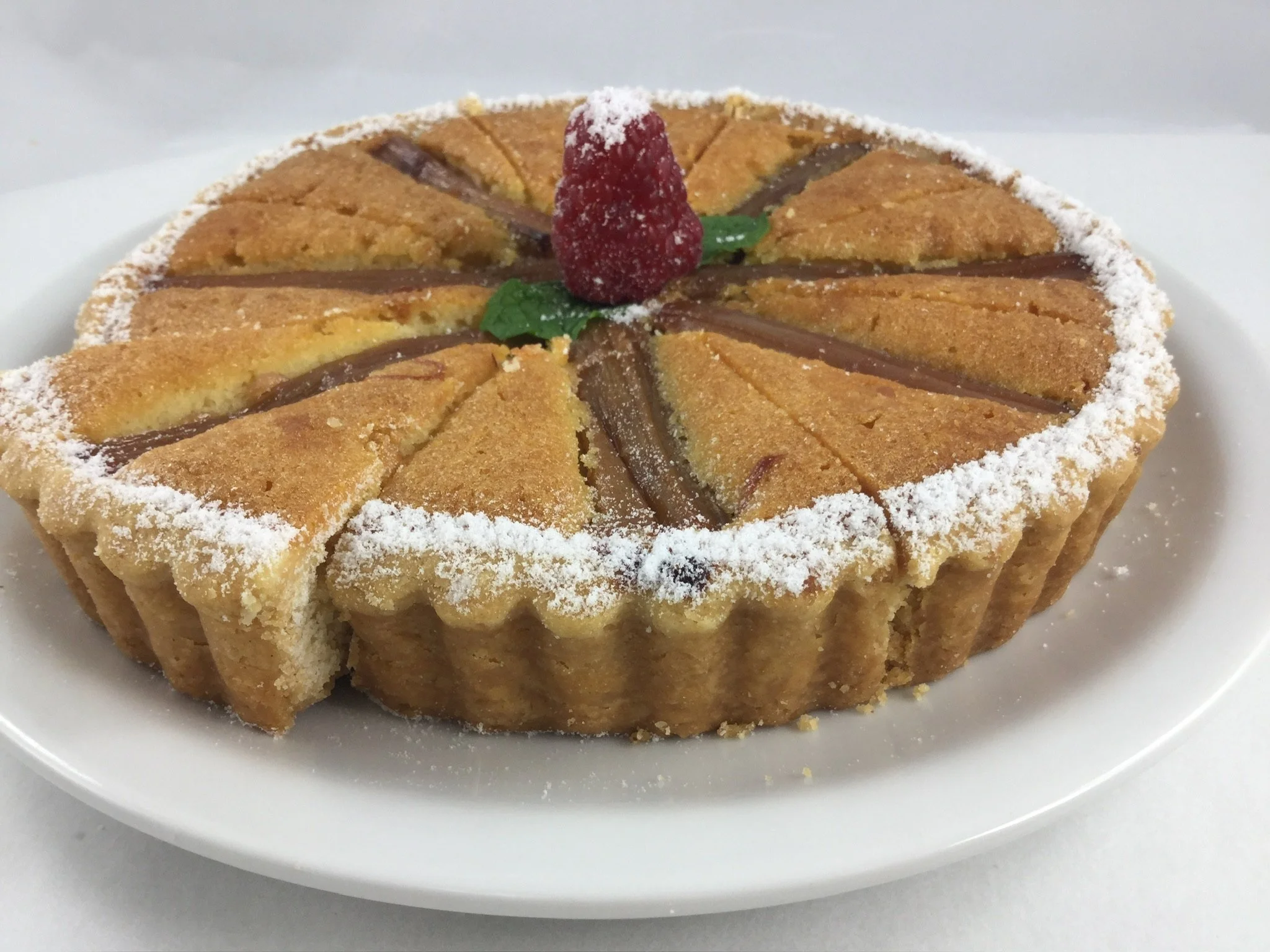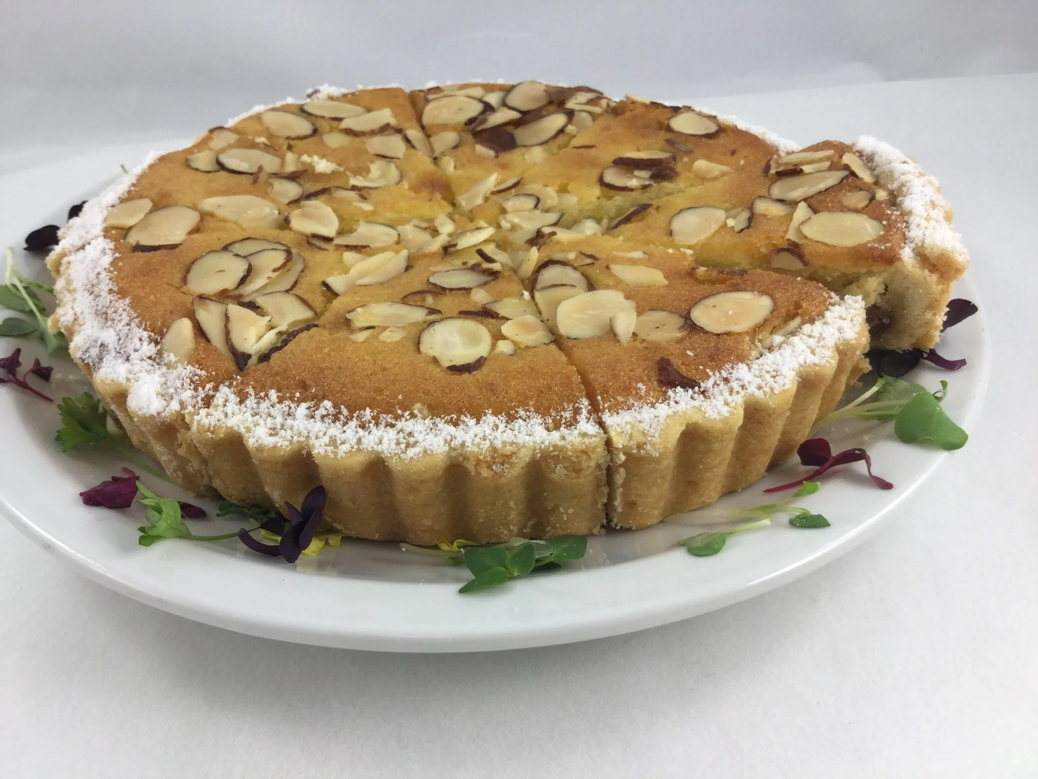 Bake well tart with a buttery pastry base, topped with almonds and filled with raspberry jam.