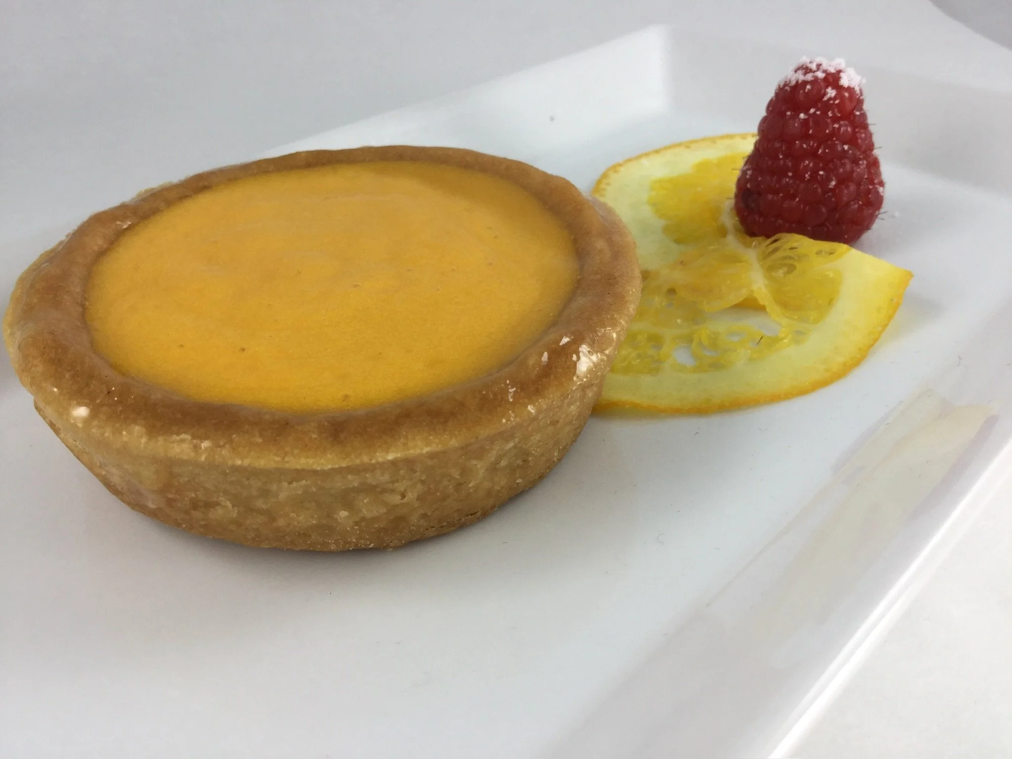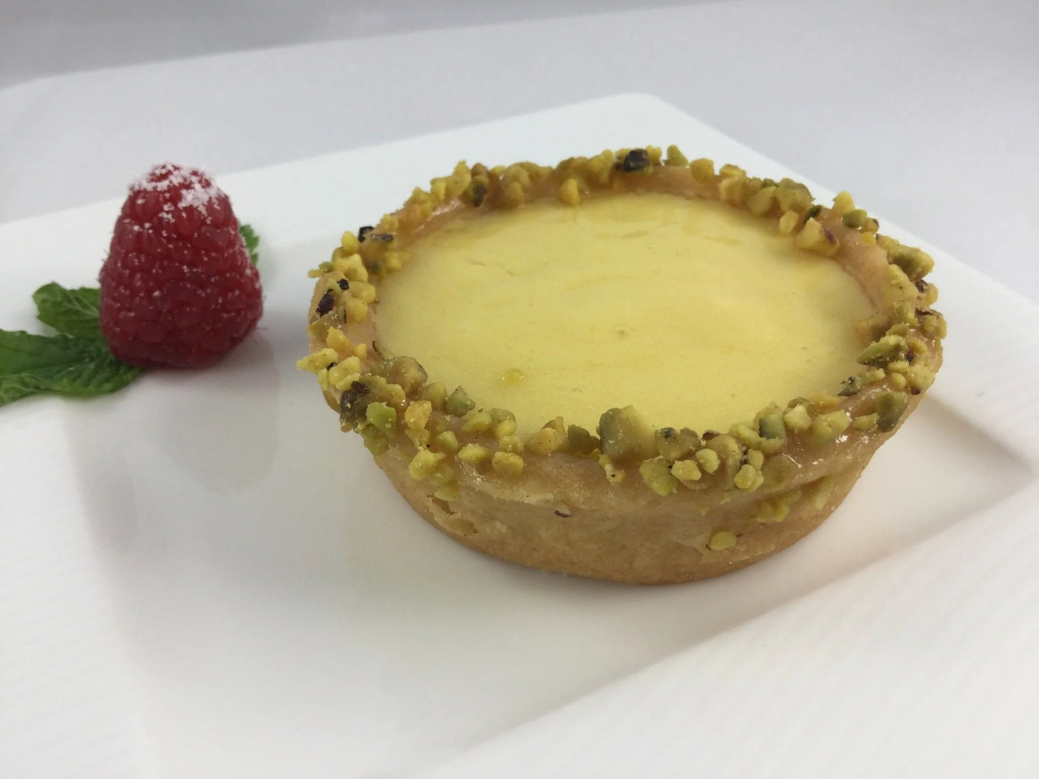 Passion fruit tart with a tangy and vibrant filling complemented by crunchy pistachios.