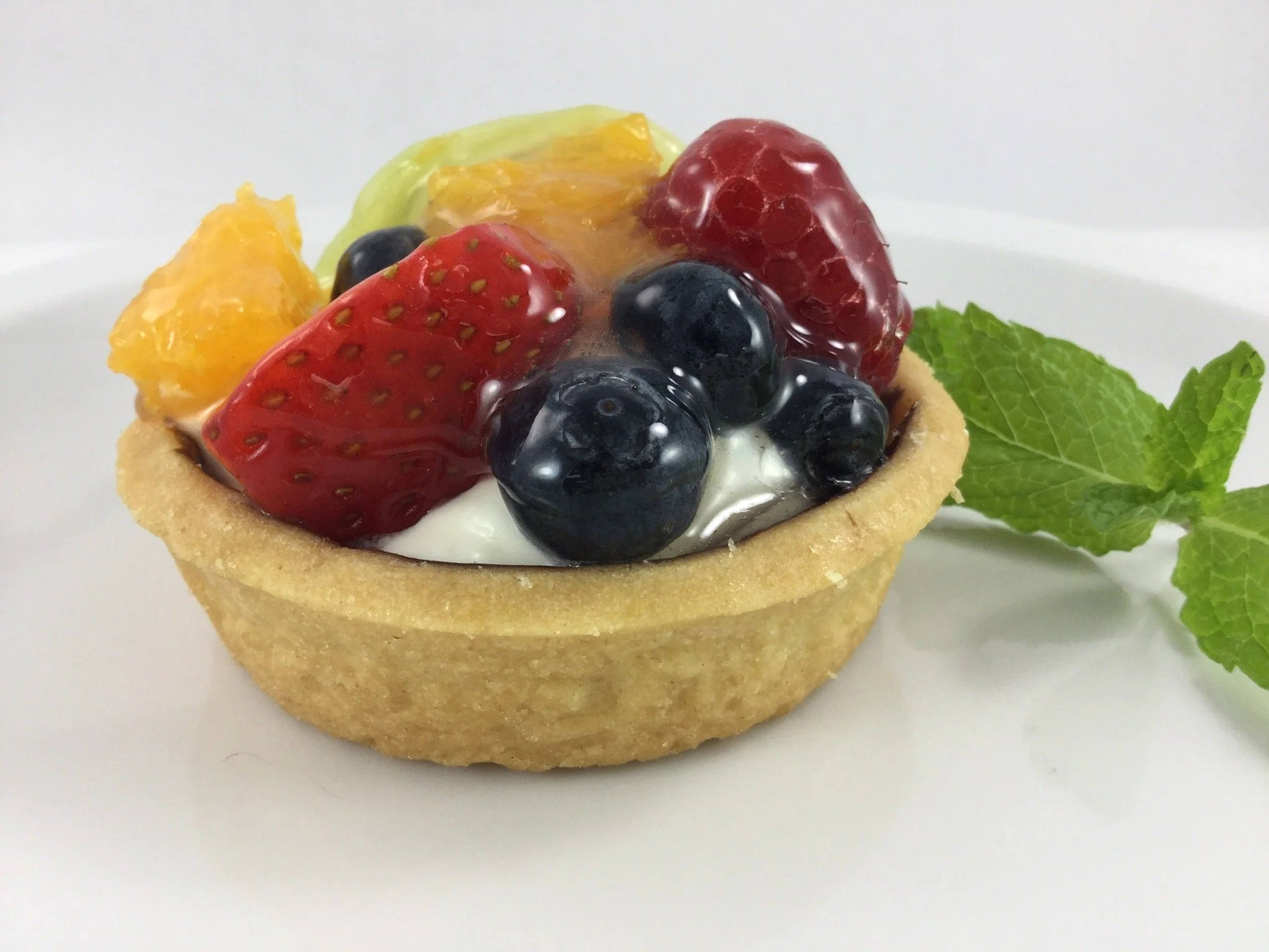 A delightful mini fruit tart mousse with a creamy filling and a fresh, vibrant fruit topping.